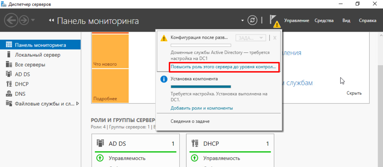 Далее необходимо настроить Active Directory. Для этого требуется нажать на иконку флага с восклицательным знаком в Диспетчере устройств и выбрать «Повысить роль этого сервера до уровня контроллера домена» (см. Рисунок – Настройка Active Directory).