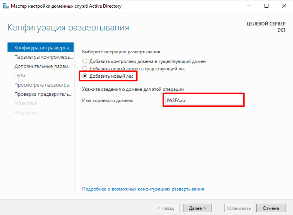В открывшемся окне «Мастер настройки доменных служб Active Directory» выбрать «Добавить новый лес» и указать имя корневого домена. Имя «IW2FA.ru» указано в качестве примера (см. Рисунок – Конфигурация Active Directory).
