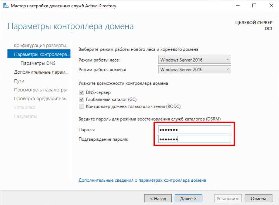 На следующем шаге необходимо придумать пароль для службы восстановления каталогов (см. Рисунок – Пароль для службы восстановления каталогов).