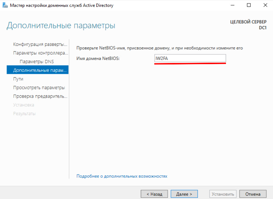 На следующем этапе мастер настройки автоматически пропишет имя домена NetBIOS. При необходимости возможно изменить его (см. Рисунок – Имя домена NetBIOS).