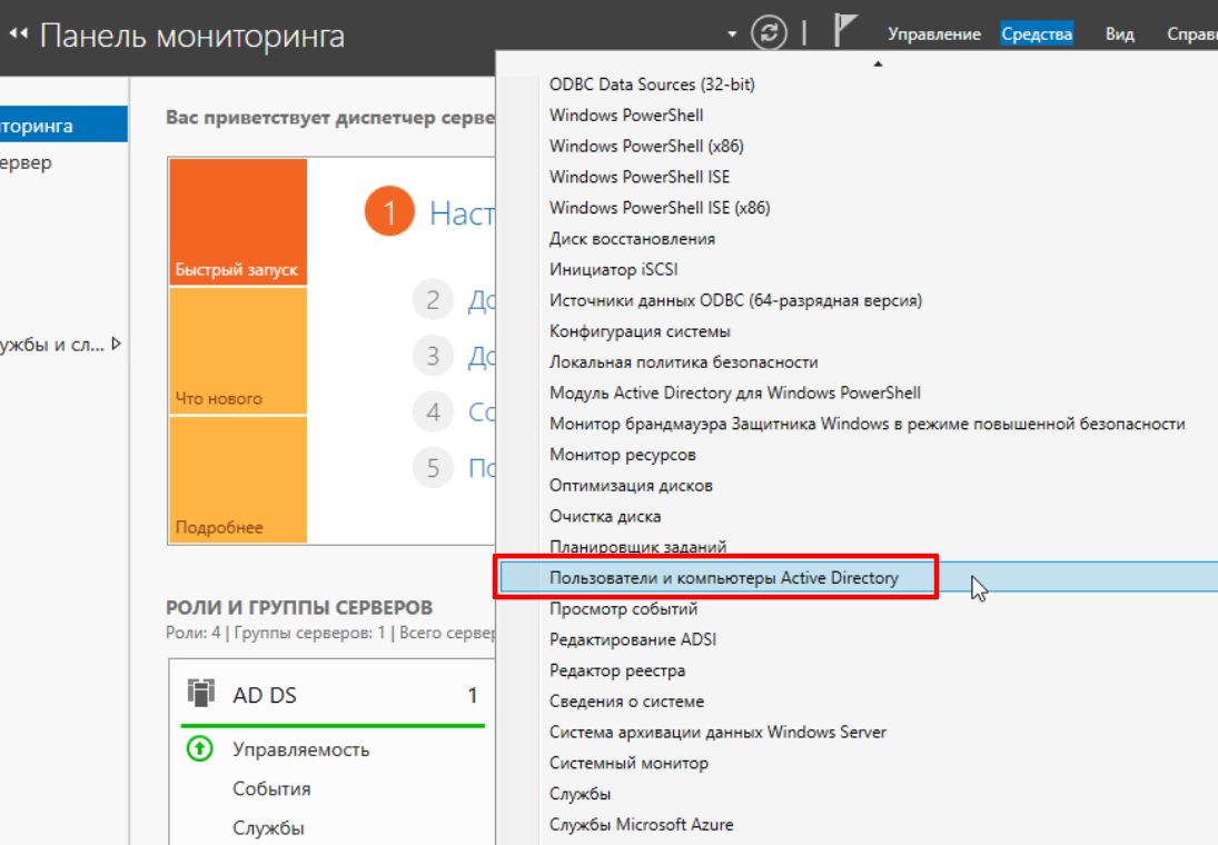 Перейти в диспетчер серверов, открыть вкладку «Средства» и выбрать «Пользователи и компьютеры Active Directory» (см. Рисунок – Настройка пользователей Active Directory).