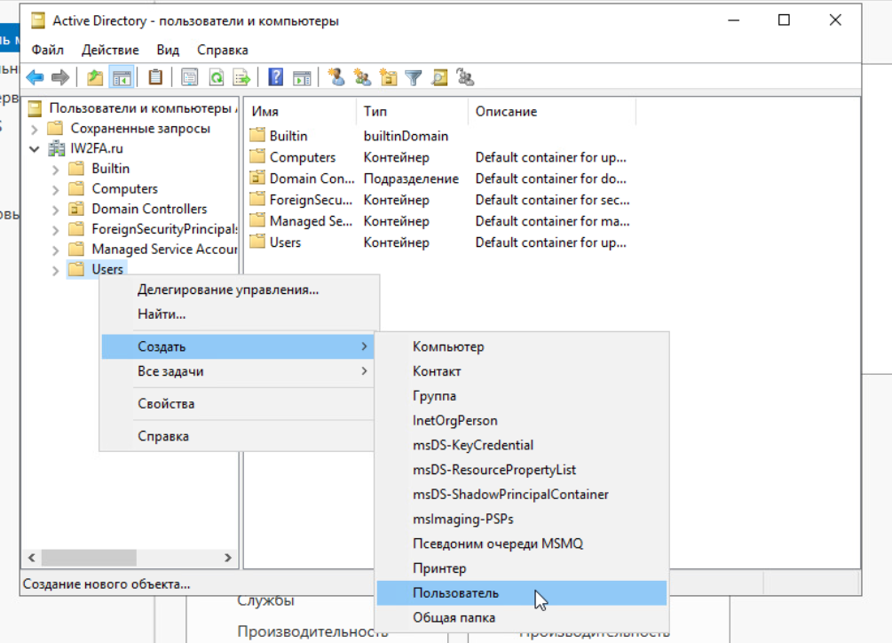 В открывшемся окне «Active Directory - пользователи и компьютеры» перейти в лес «IW2FA.ru», нажать ПКМ по директории «Users» и выбрать «Создать». В меню «Создать» выбрать «Пользователь» (см. Рисунок – Добавление пользователя).