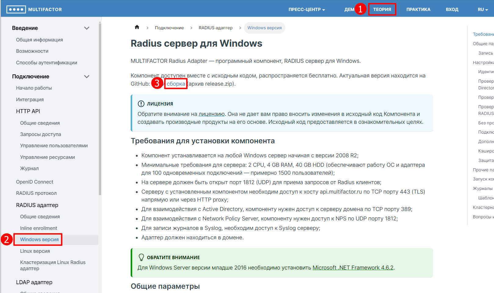 Необходимо скачать актуальную версию утилиты Radius адаптер с официального сайта https://multifactor.ru. Для этого в пункте «Теория» перейти во вкладку «RADIUS адаптер» и затем во вкладку «Windows версия», далее перейти по ссылке «сборка» (см. Рисунок – Документация Radius адаптера).