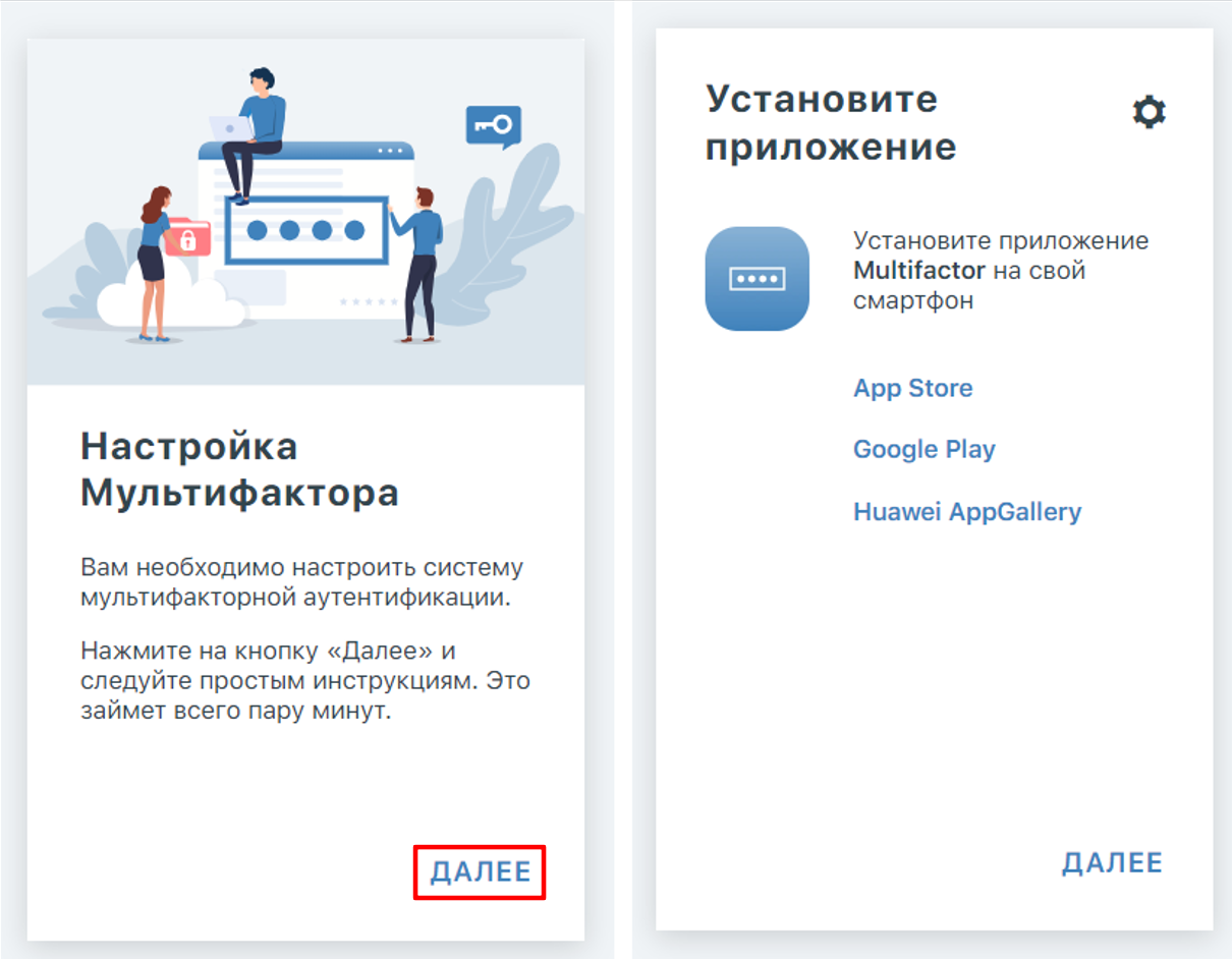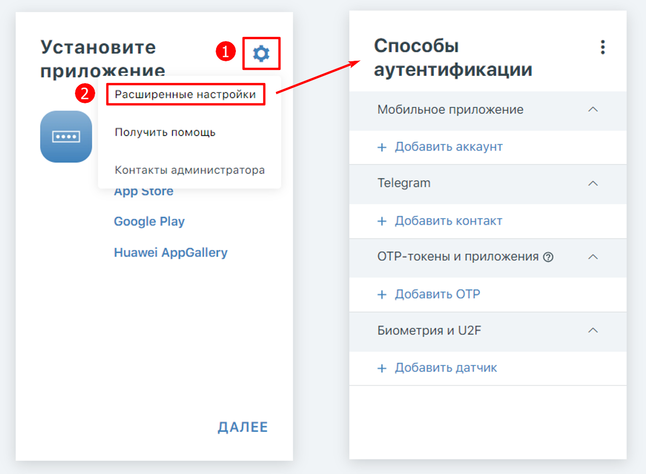 После завершения регистрации будет запущен мастер настройки многофакторной аутентификации для административной панели. Будет предложено установить приложение Multifactor на смартфон для входа на сайт (см. Рисунок – Установка приложения Multifactor). Если необходимо выбрать другой способ аутентификации, требуется нажать на значок в виде шестерёнки в правом верхнем углу окна настройки, перейти в раздел «Расширенные настройки» и выбрать подходящий способ аутентификации (см. Рисунок – Расширенные настройки).