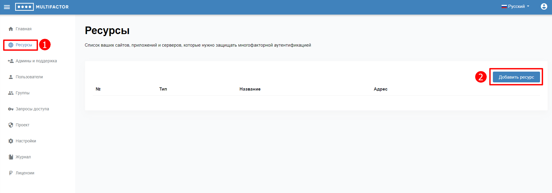 В панели администратора перейти в раздел «Ресурсы» и нажать кнопку «Добавить ресурсы» (см. Рисунок – Добавление ресурсов).