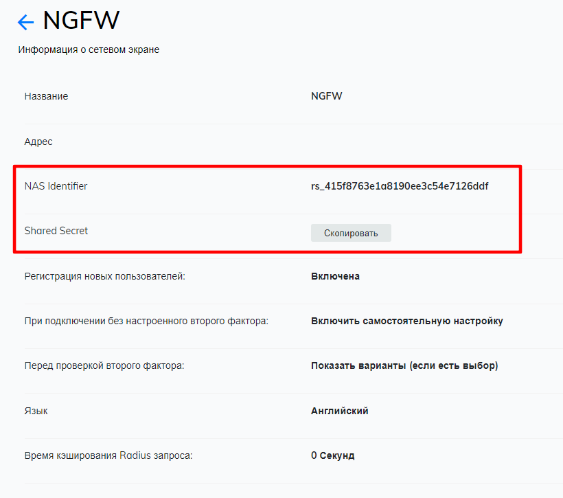 После добавления ресурса откроется окно с его параметрами. Необходимо скопировать параметры «NAS Identifier» и «Shared Secret» (см. Рисунок – Параметры добавленного ресурса). Они необходимы для конфигурирования Radius адаптер на Windows Server и для добавления Radius-server в ARMA Стена.