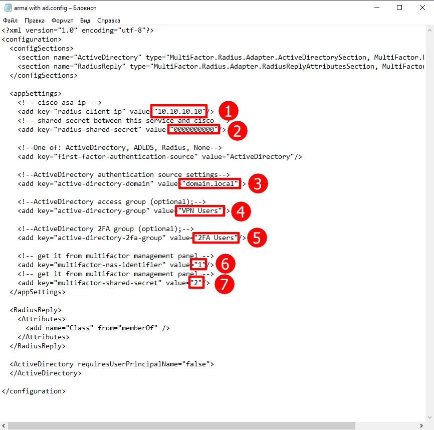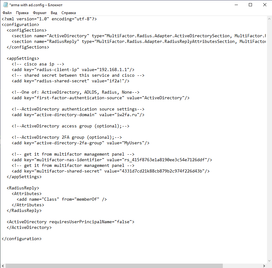 Открыть полученный файл «arma with ad.config» для редактирования с помощью программы «Блокнот» и внести следующие изменения в файле (см. Рисунок – Исходный шаблон конфигурации):