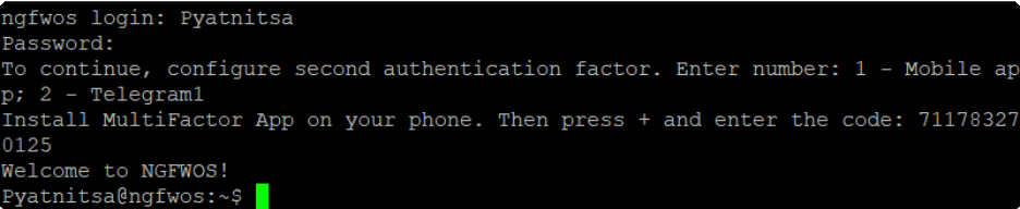При входе в NGFW и аутентификации с использованием учётных данных из группы, указанной в поле «active_directory_2fa_group» при настройке адаптера, система предложит зарегистрировать второй фактор аутентификации для пользователя (если он ещё не был зарегистрирован). В случае, если второй фактор уже зарегистрирован, система проверит его (см. Рисунок – Аутентификация):
