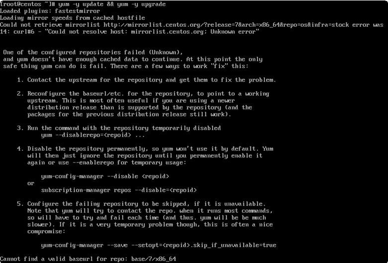 Для начала установки компонента Multifactor Radius Adapter необходимо обновить имеющиеся пакеты и проверить наличие доступа к репозиториям. Это осуществляется с помощью команды «yum -y update && yum -y upgrade». Однако при выполнении этой команды может возникнуть ошибка (см. Рисунок – Возможная ошибка).