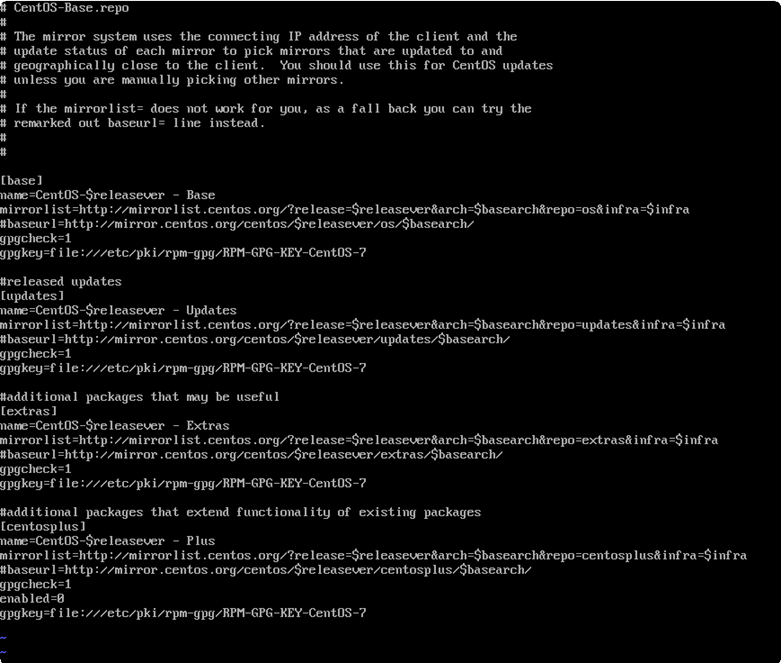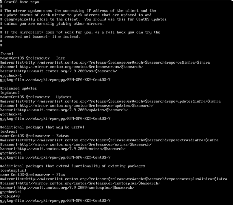 Это свидетельствует о том, что доменное имя зеркал репозиториев не разрешается по неизвестной причине. Данная проблема может быть решена путём настройки других репозиториев, которые находятся в каталоге «/etc/yum.repos.d/CentOS-Base.repo». Вот так выглядят репозитории по умолчанию (см. Рисунок – Репозитории по умолчанию):
