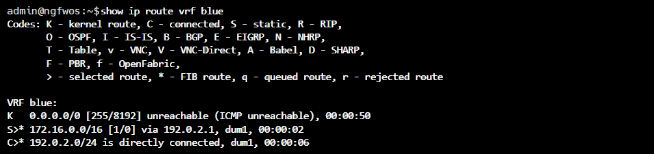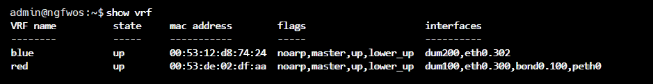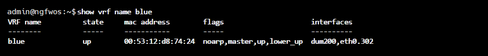 <vrf_name> – имя VRF-экземпляра. Имя экземпляра VRF должно начинаться с буквы латинского алфавита, содержать не более 15 символов, не совпадать с именами стандартных сетевых интерфейсов (например, eth0, lo, wlan1 и т.п.) и может включать только латинские буквы, цифры и символ подчёркивания «_»;