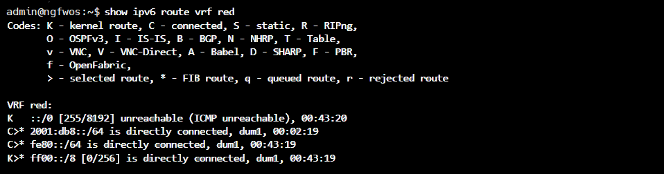 vrf1 up aa:9c:df:35:8a:5e noarp,master,up,lower_up eth1,pim6reg200