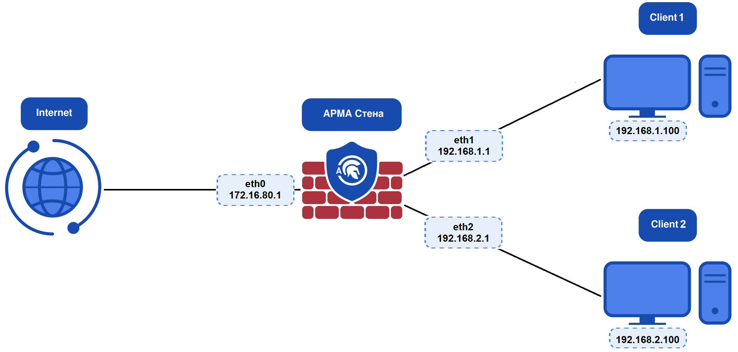 Система ARMA Стена поддерживает использование VRF (Virtual Routing and Forwarding), что позволяет создавать изолированные домены маршрутизации в пределах одного устройства. Одним из вариантов использования является решение задачи мультиарендности (multi-tenancy), когда требуется обеспечить изоляцию трафика между различными клиентами или отделами внутри одной организации. Каждый VRF-домен имеет собственную таблицу маршрутов, собственный набор интерфейсов и собственный шлюз по умолчанию.