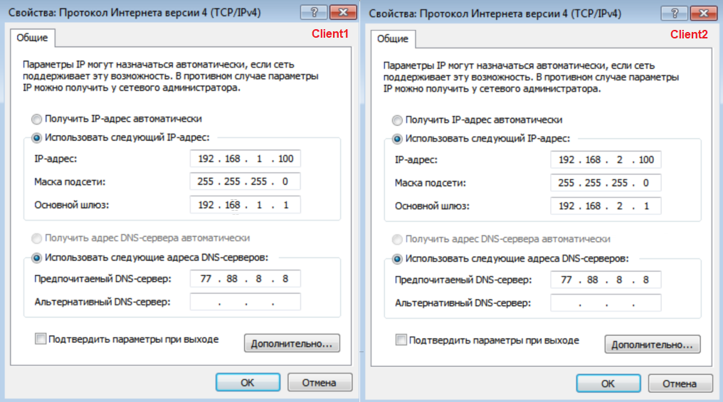 Для компьютеров «Client1» и «Client2», функционирующих под управлением операционной системы семейства Windows, необходимо произвести конфигурацию сетевых адаптеров (см. Рисунок – Настройка IP-адреса).