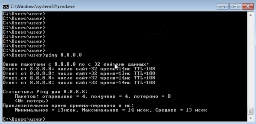 По завершении процедуры настройки IP-адреса следует проверить доступность интернет-соединения на компьютере «Client1» посредством команды ICMP-запроса к DNS-серверу 8.8.8.8 (см. Рисунок – Проверка доступа к сети Интернет).