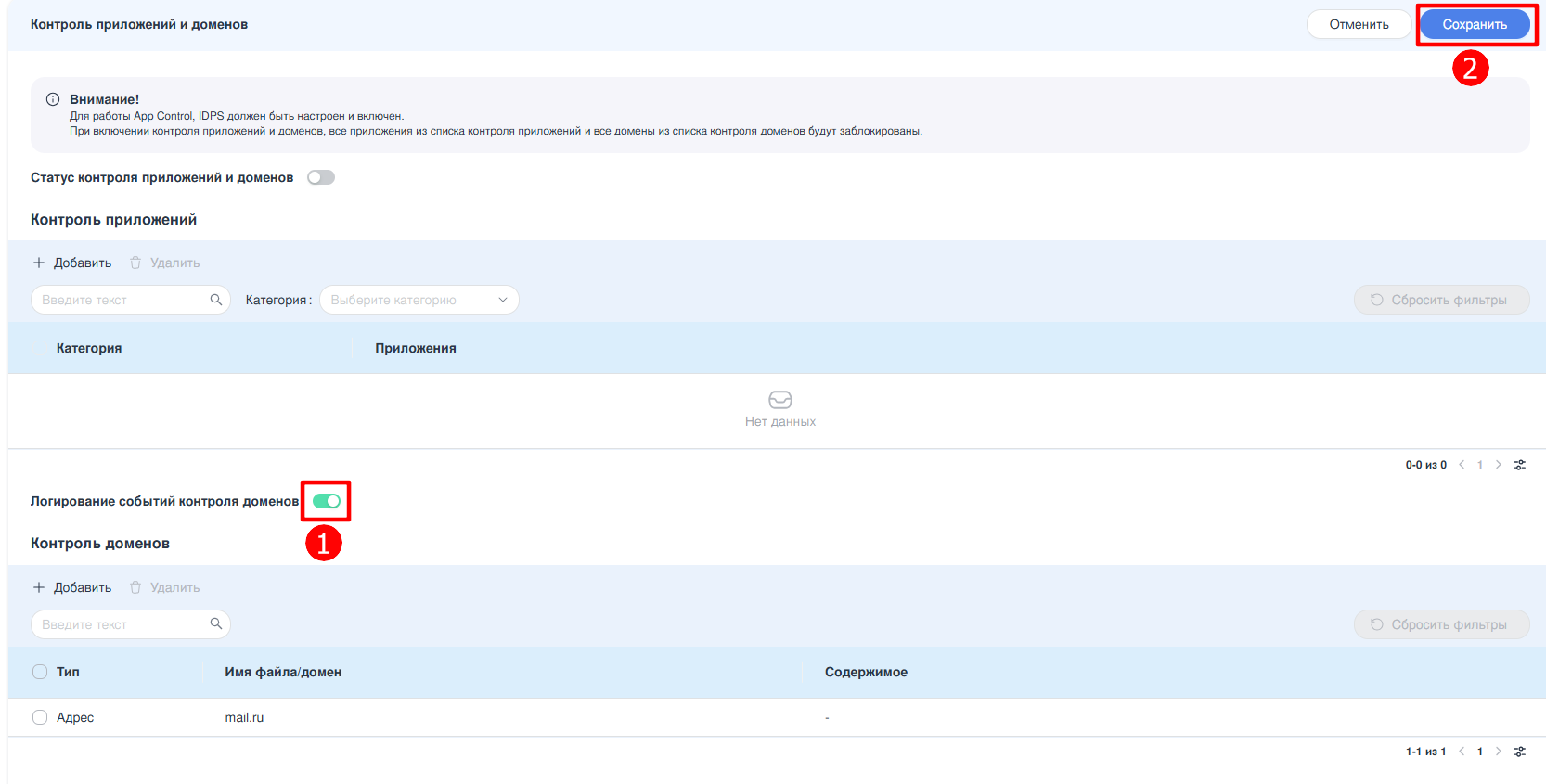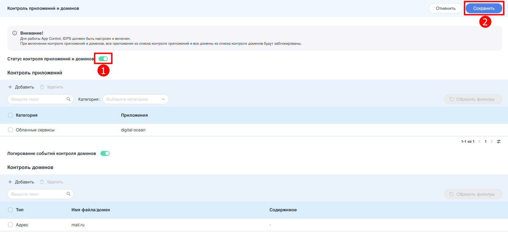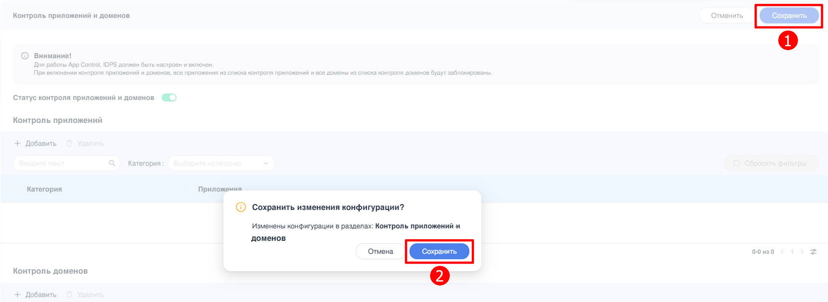 После завершения настройки всех необходимых параметров в разделе «Контроль приложений и доменов» необходимо сохранить внесённые изменения. Для этого следует нажать кнопку «Сохранить», расположенную в правом верхнем углу заголовка раздела «Контроль приложений и доменов».