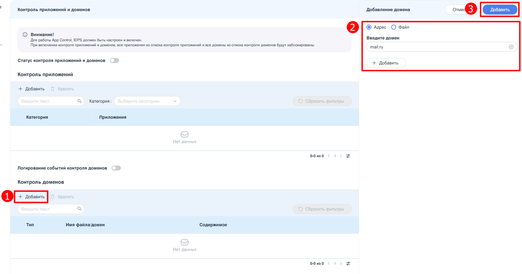 Нажать кнопку «+Добавить» в таблице «Контроль доменов».