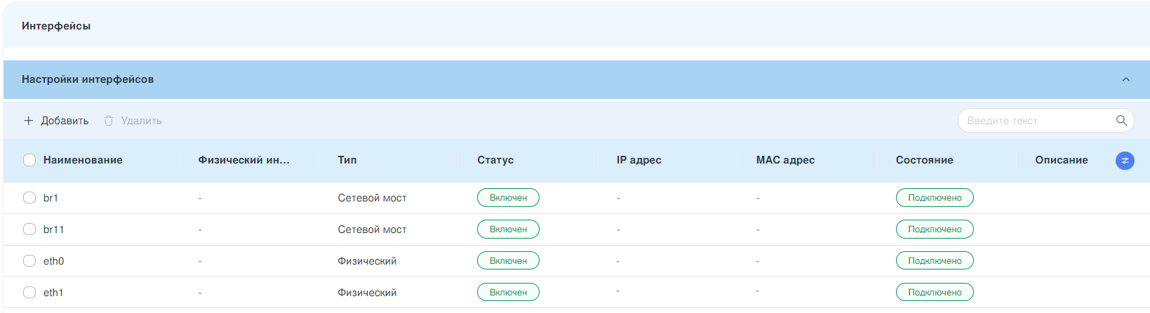 В ARMA Стена добавление и настройка сетевых мостов производится в разделе «Настройки интерфейсов» (см. Рисунок – Панель настройки интерфейсов).