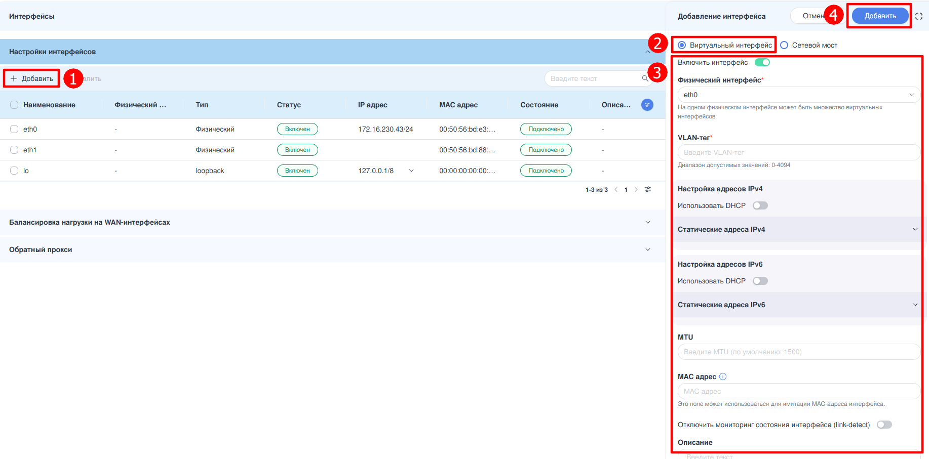По завершению нажать кнопку «Сохранить» (см. Рисунок – Добавление виртуального интерфейса).