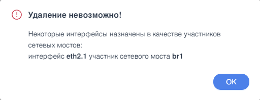 Если сетевой интерфейс включён в состав сетевого моста, операция его удаления будет заблокирована, и система выдаст соответствующее предупреждение (см. Рисунок – Удаление невозможно).
