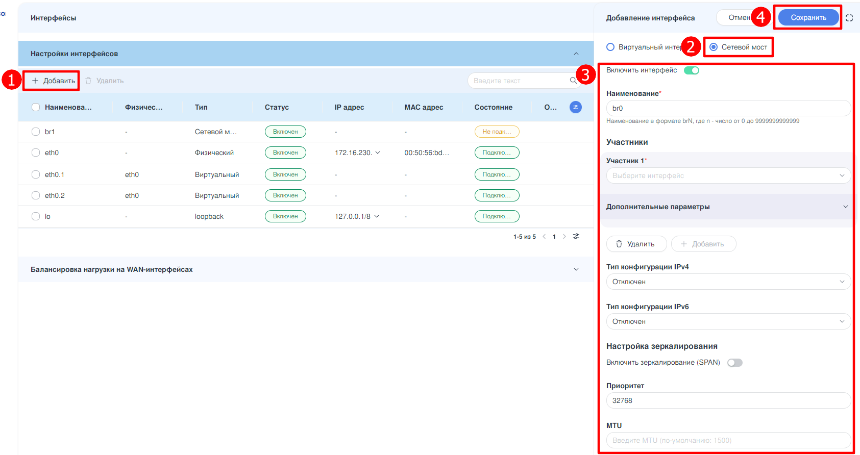 В открывшейся боковой панели «Добавление интерфейса» выбрать создаваемый объект «Сетевой мост» и заполнить параметры: