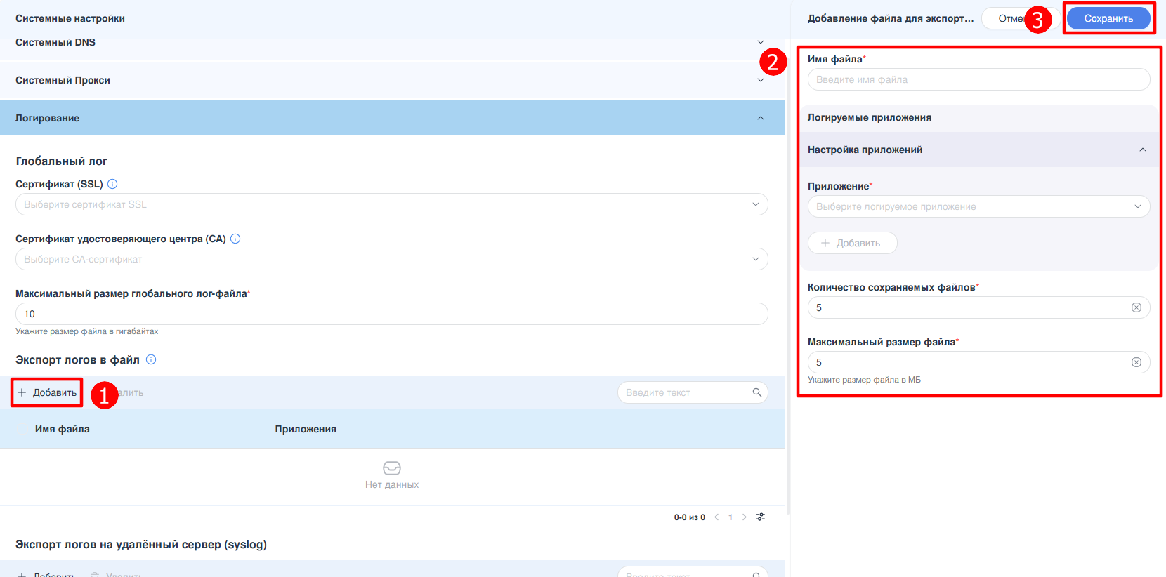Для настройки экспорта логов необходимо выполнить следующие действия: