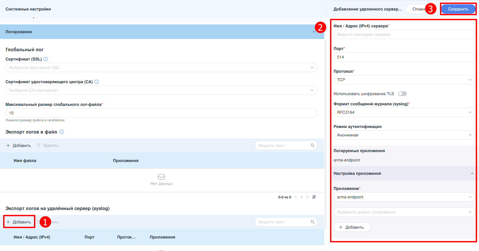В таблице «Экспорт логов на удалённый сервер (syslog)» нажмите кнопку «+ Добавить».