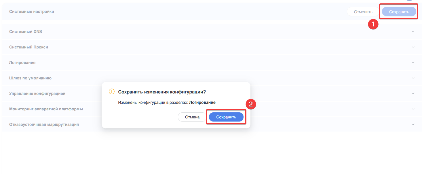 После завершения настройки всех необходимых параметров в подразделе «Логирование» необходимо сохранить внесённые изменения. Для этого следует нажать кнопку «Сохранить», расположенную в правом верхнем углу заголовка раздела «Системные настройки».