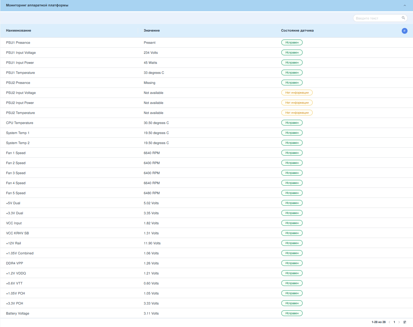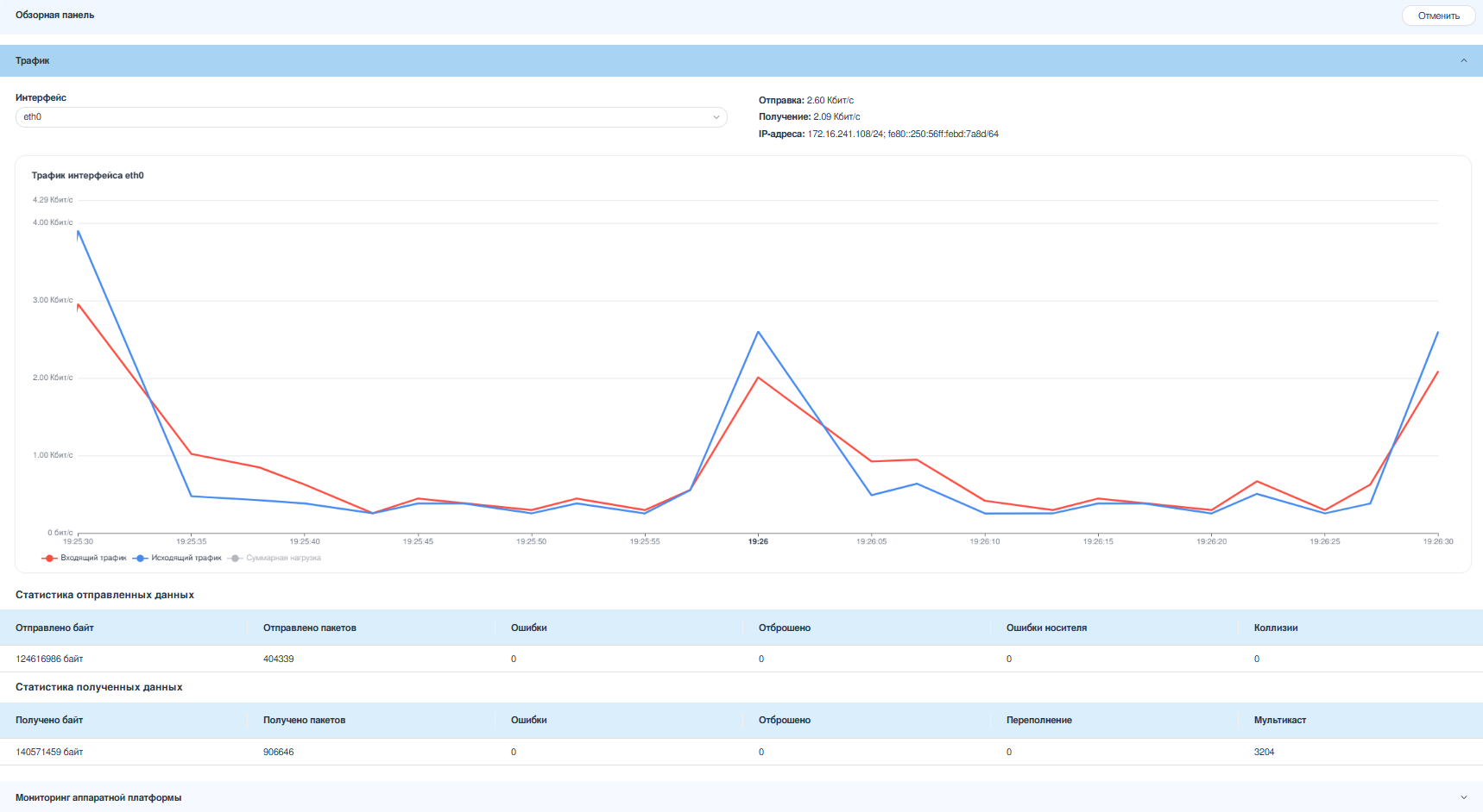Для просмотра состояния аппаратной платформы системы необходимо в меню «Обзорная панель» выбрать раздел «Мониторинг аппаратной платформы» (см. Рисунок – Мониторинг аппаратной платформы).