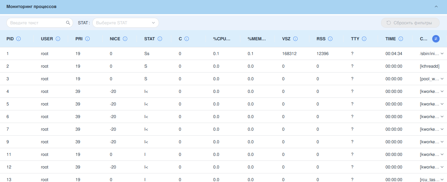 Раздел «Мониторинг процессов» предназначен для отображения текущего состояния системных и пользовательских процессов, активных на устройстве. Информация представлена в табличном виде и автоматически обновляется с периодичностью 5 секунд. Для доступа к разделу необходимо перейти по пути: «Обзорная панель» - «Мониторинг процессов» (см. Рисунок – Мониторинг процессов).
