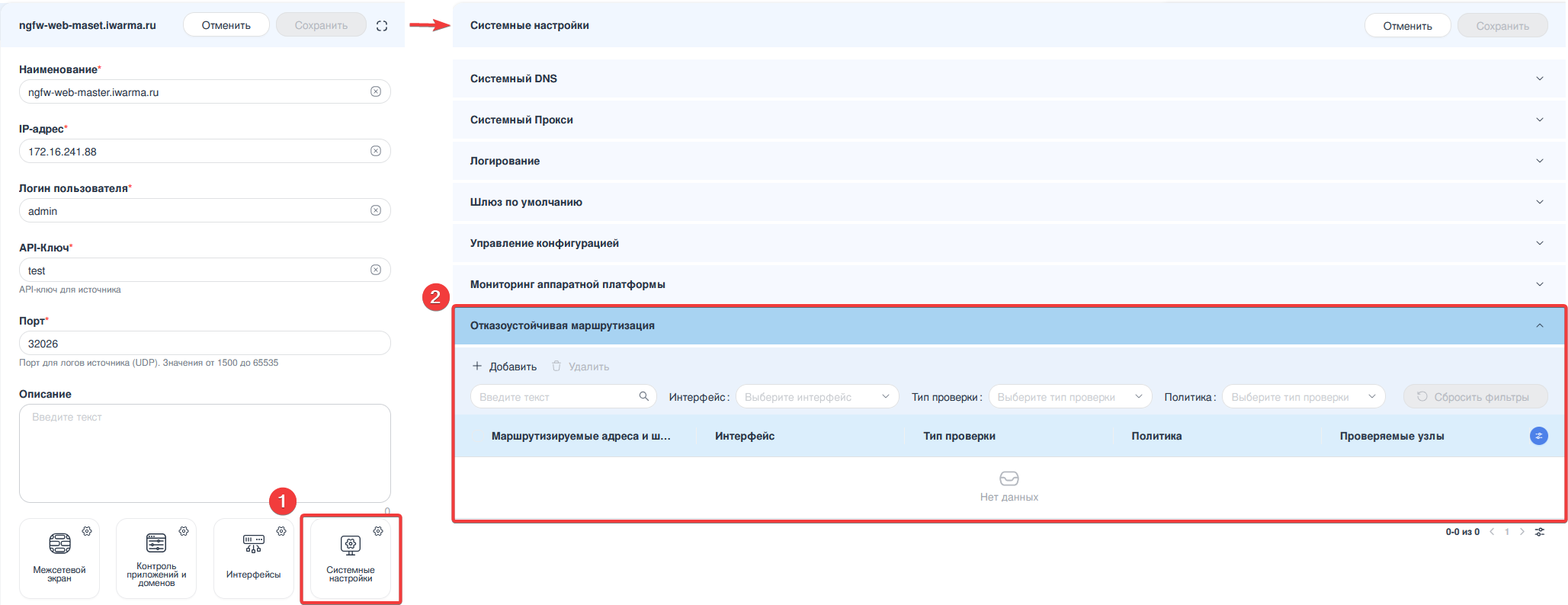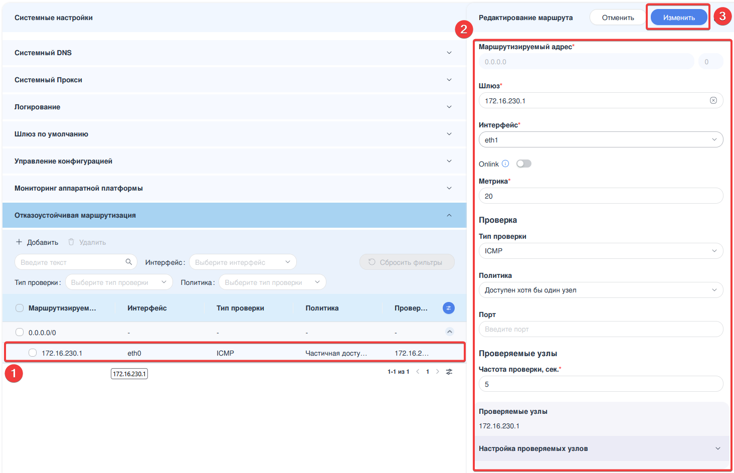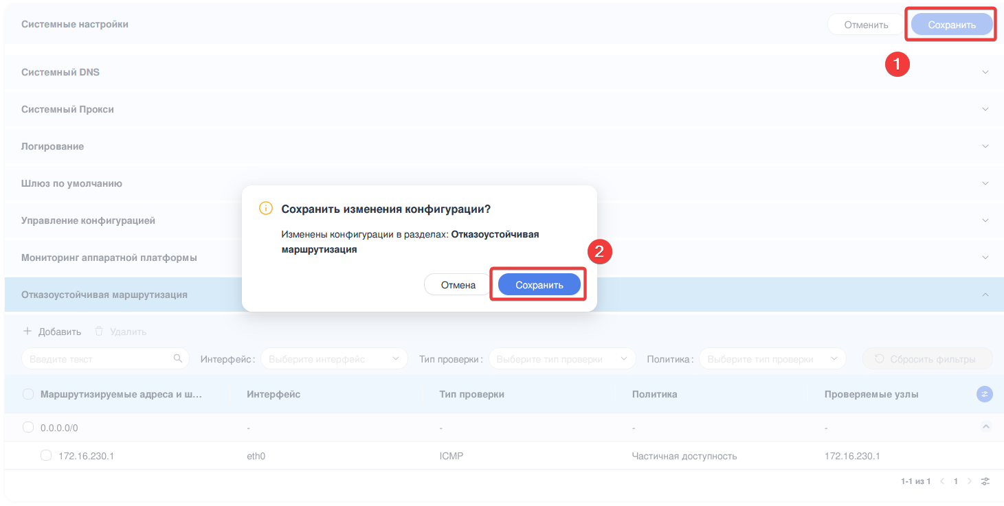После завершения настройки всех необходимых параметров в подразделе «Отказоустойчивая маршрутизация» необходимо сохранить внесённые изменения. Для этого следует нажать кнопку «Сохранить», расположенную в правом верхнем углу заголовка раздела «Системные настройки».