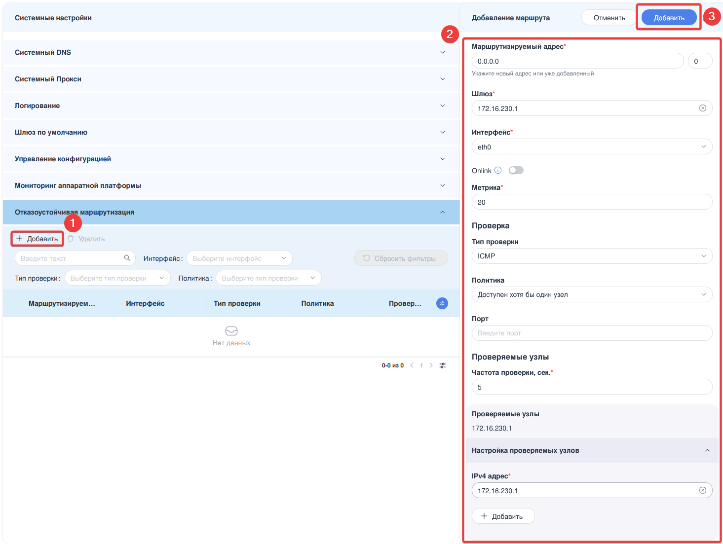 В таблице подраздела «Отказоустойчивая маршрутизация» нажать кнопку «+Добавить».