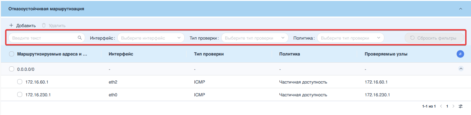 В таблице подраздела «Отказоустойчивая маршрутизация» выбрать одну или несколько записей, установив флажок в соответствующем чек-боксе слева от маршрута или шлюза.