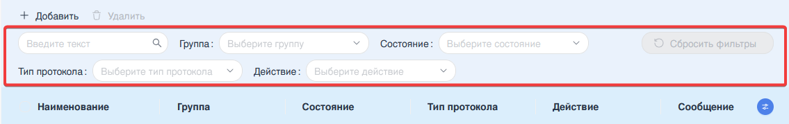 Фильтрация по полю «Тип протокола» позволяет отфильтровать список по типу протокола. Поле содержит выпадающий список и предоставляет выбор из протоколов, которые доступны на текущий момент.