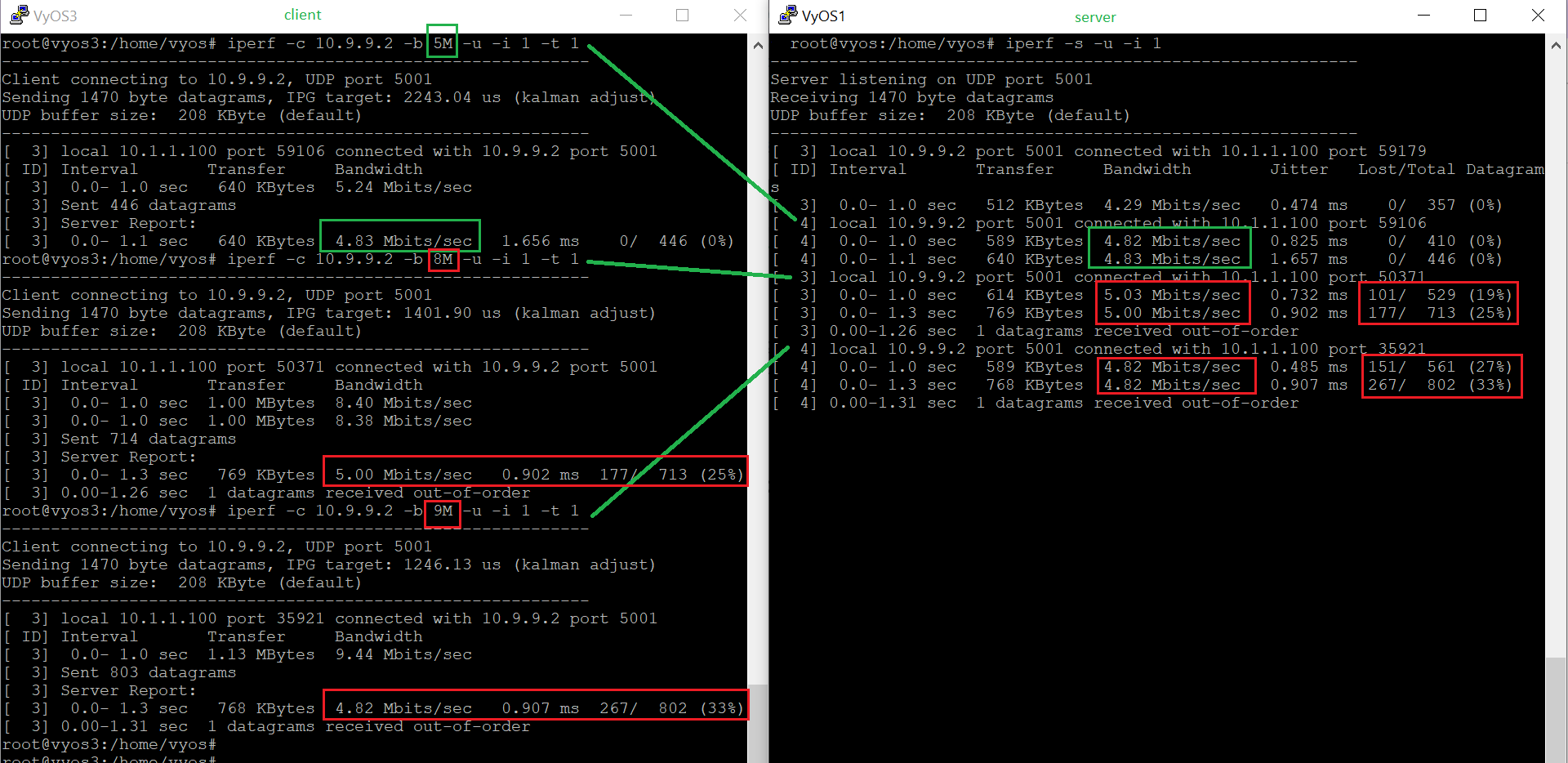 In the end, on the router “VyOS2” we will set outgoing bandwidth limits between the “VyOS3” and “VyOS1” routers. Let’s set a limit for IP 10.1.1.100 = 5 Mbps(Tx). We will check the result of the work with the help of the “iPerf” utility.