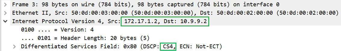 Set IP addresses on all VPCs and a default gateway 172.17.1.1. We’ll use in this case only static routes. On the VyOS3 router, we need to change the ‘dscp’ labels for the VPCs. To do this, we use this configuration.